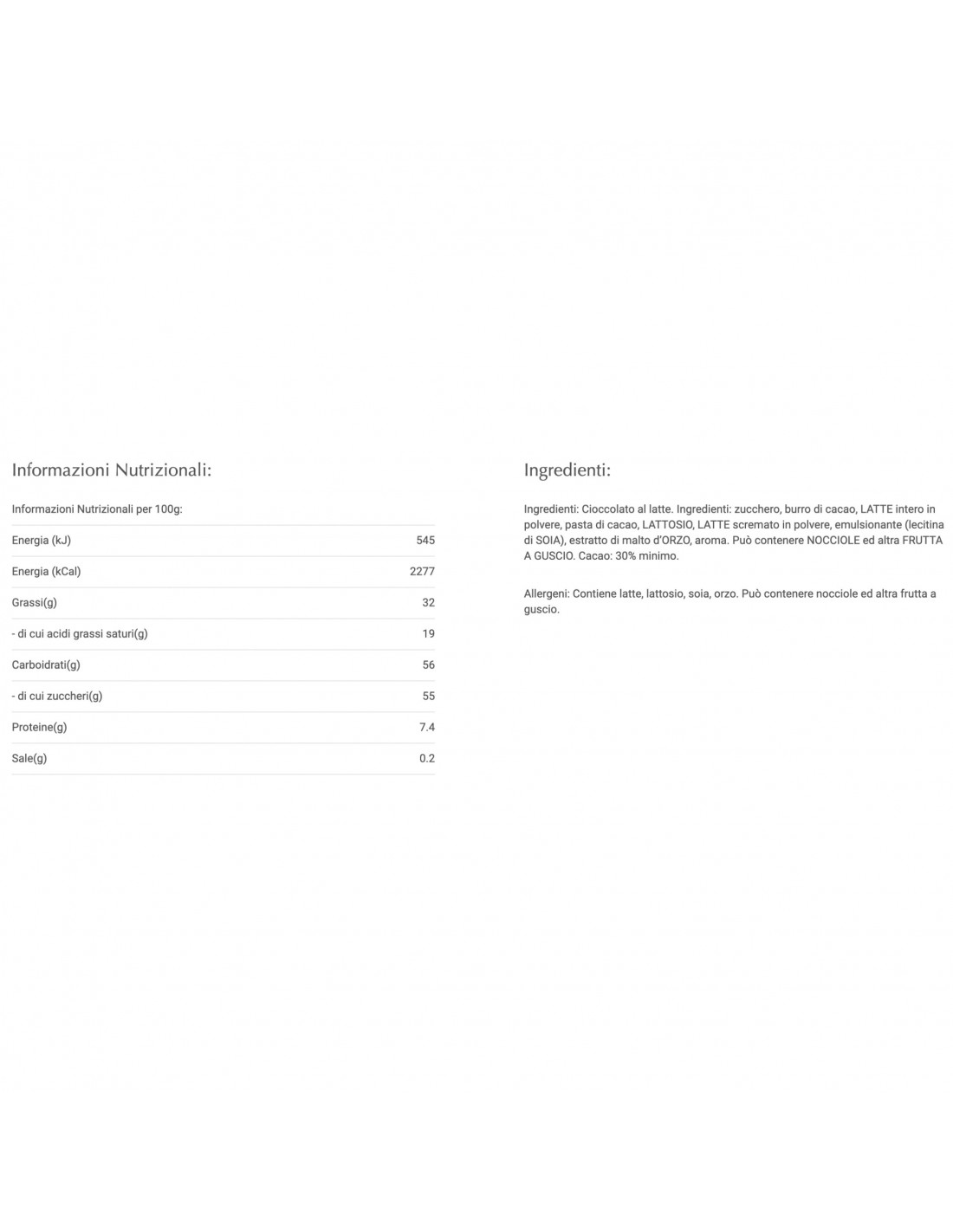 Cioccolato al latte. Ingredienti: zucchero, burro di cacao, LATTE intero in polvere, pasta di cacao, LATTE scremato in polvere, LATTOSIO, estratto di malto d’ORZO, emulsionante (lecitina di SOIA), aromi. Può contenere NOCCIOLE ed altra FRUTTA A GUSCIO. Cacao: 30% minimo SENZA GLUTINE.