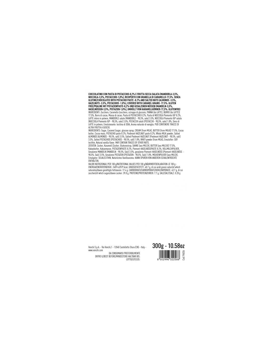 Ingredienti: zucchero, caramello (zucchero, sciroppo di glucosio, PANNA (da latte), BURRO (da latte 17.5%), burro di cacao, massa di cacao, pasta di PISTACCHIO (8.2%), pasta di NOCCIOLA di Piemonte IGP (8.2%), LATTE intero in polvere, mandorle salate (MANDORLE (98,5%) e sale (3.5%), nocciola di Piemonte IGP salata (NOCCIOLA Piemonte IGP (98,5%) e sale (3.5%), pistacchi salati (PISTACCHI (98,5%), sale (1.8%), siero di LATTE in polvere.