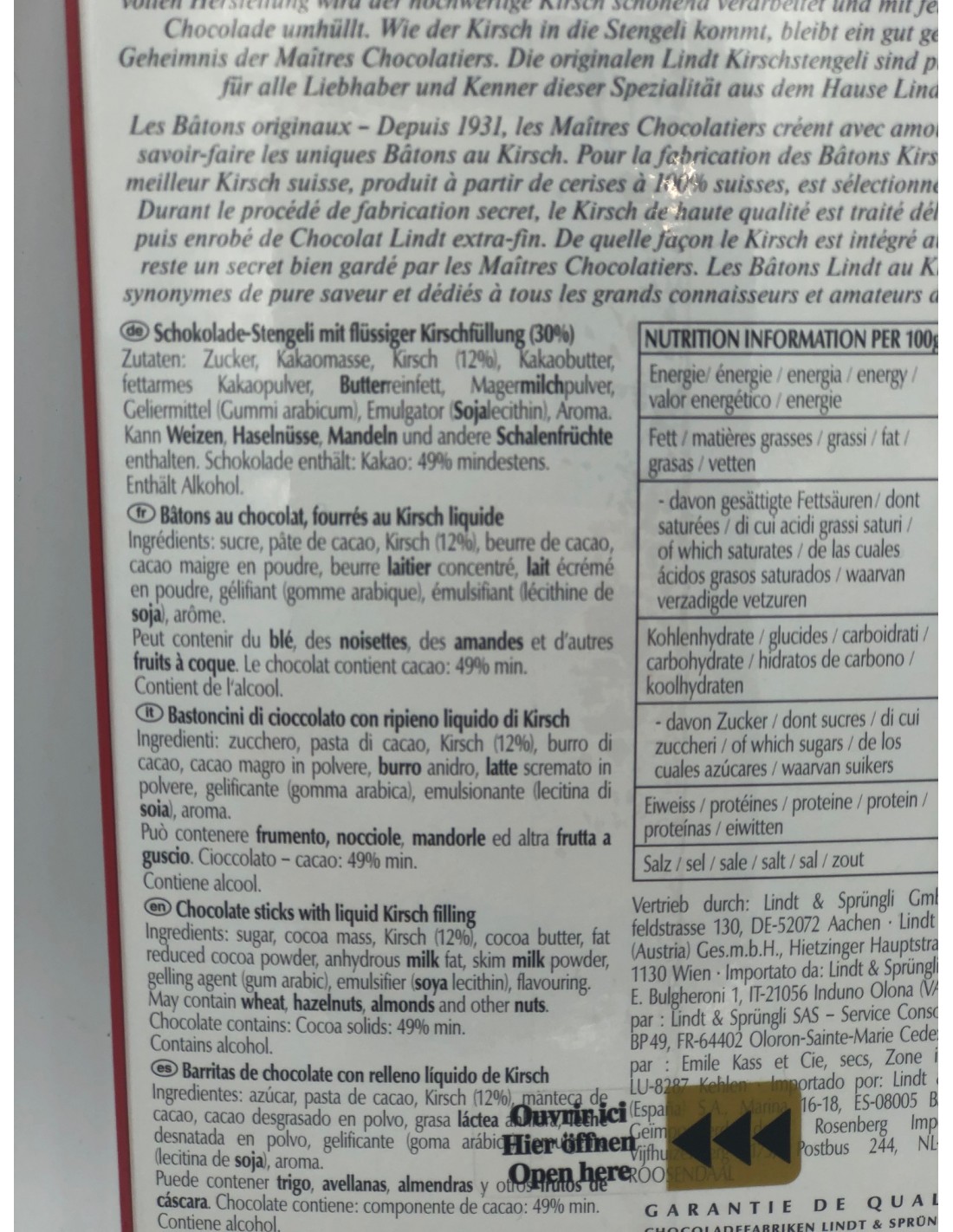 Ingredienti: zucchero, pasta di cacao, Kirsch (12%), burro di cacao, cacao magro in polvere, BURRO anidro, LATTE scremato in polvere, gelificante (gomma arabica).