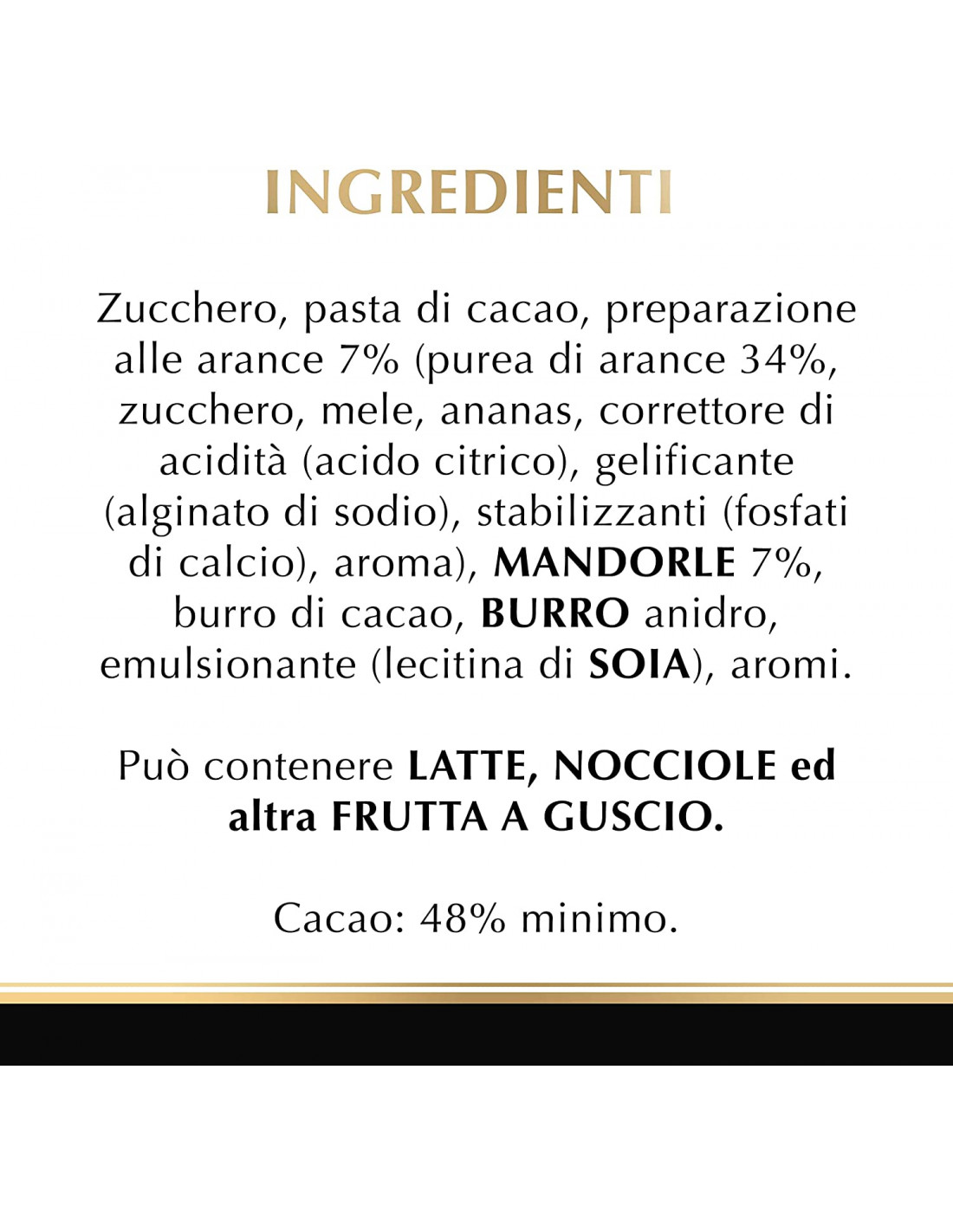 Ingredienti: zucchero, pasta di cacao, preparazione alle arance 7% (purea di arance 34%, zucchero, mele, ananas, correttore di acidità: acido citrico, gelificante: alginato di sodio, stabilizzanti: fosfati di calcio, aromi), MANDORLE 7%, burro di cacao, BURRO anidro, aromi.