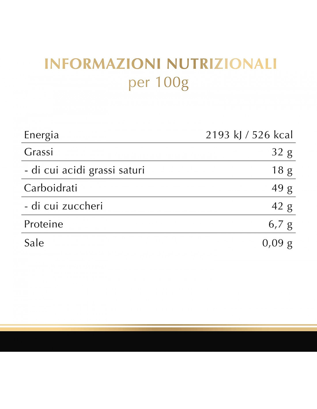 Valori nutrizionali per 100g: Energia 2193Kj/526Kcal, Grassi 32g di cui acidi grassi saturi 18g, Carboidrati 49g di cui zuccheri 42g, Proteine 6,7g, Sale 0,09g.
